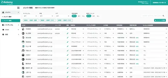 Aidemy GXは、管理者に嬉しい機能が充実しています。受講生の学習進捗管理、カリキュラム管理、理解度確認テスト、タグ管理、など人材育成を効率的に進めるための機能が満載です。データはCSVダウンロードも可能なので、結果の社内展開・分析も可能です。
